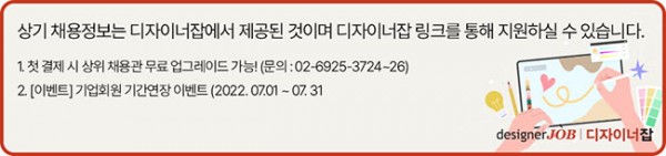 | 채용업종 | 의상/의류디자이너,잡화디자이너,그래픽/CG디자이너,시각디자이너,일러스트레이터/포토샵 |