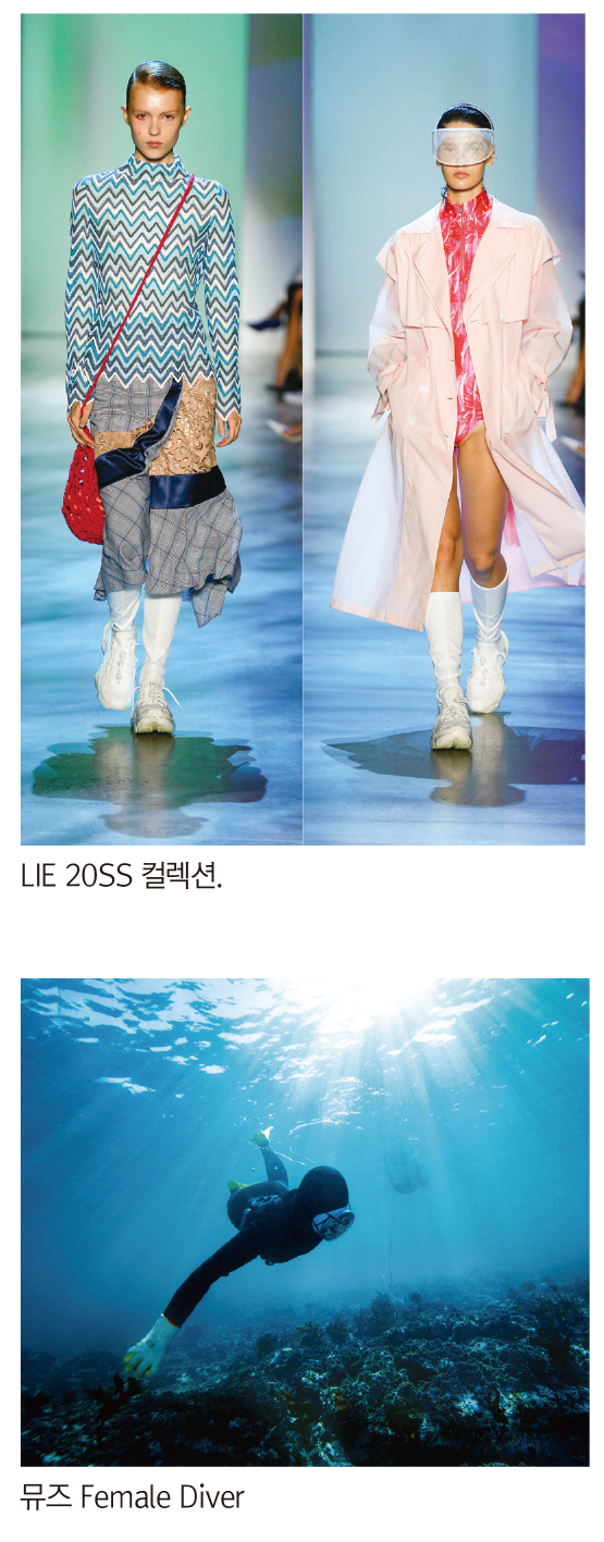 LIE 20SS 컬렉션은 한국의 유네스코 인류무형문화유산인 해녀에게서 영감을 받았다. 할머니가 어머니에게 전해주었고, 어머니가 딸에게 전해주었던 정신과 용기는 소녀에게 차갑고 깊은 물에 대한 두려움보다 푸른 바다 속 새로운 세상을 탐구하는 설렘을 안겨주었고, 거친 파도 속에서도 소녀를 지켜주었던 방패이자 자유롭게 헤엄칠 수 있는 날개가 되었다.