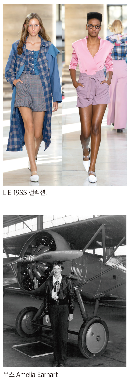 대서양을 최초로 횡단한 여성 조종사인 아멜리아 에어하트로부터 영감을 받은 LIE 19SS 컬렉션은 새로운 세상을 향한 여성들의 도전과 열정 가득한 에너지에 대해 이야기한다. 디자이너는 그녀들이 가진 파워와 자신감, 그리고 고난과 역경을 이겨내는 내적인 아름다움을 LIE의 시그니쳐인 ‘믹스 & 매치’를 통해 다채롭게 보여준다.