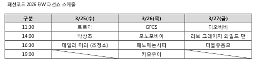 패션쇼 프로그램은 신진 디자이너의 등용문과 기성 디자이너의 도약대를 아우르는 화려한 런웨이로 꾸며진다. 개막 첫날에는 패션코드가 발굴한 대표 브랜드 ▲데일리미러의 초청 쇼가 열려 K-디자이너의 성장 가능성을 상징적으로 보여준다. 이어 ▲트로아 ▲박상조 ▲모노포비아 ▲페노메논시퍼 ▲키모우이 ▲디오비비 ▲러브 크레이지 와일드 맨 ▲더블유옴므 등 8개 브랜드의 개별 쇼와 ▲경기패션창작스튜디오(GFCS) 연합 쇼가 무대를 수놓는다.