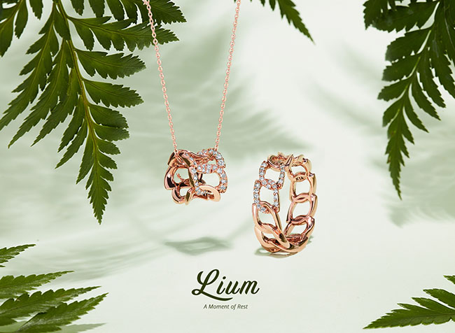 리움 컬렉셕은 크게 두 가지 라인 리움과 폴리움으로 구성됐다. 두 라인은 공통적으로 잎의 형태에서 모티브를 따 디자인을 완성, 모던하면서도 유연한 실루엣으로 표현됐다. 그중에서도 리움 라인은 각각의 유닛들을 규칙적으로 배열해 완벽한 균형감을 이룬다. 동시에 화이트 스톤 세팅으로 마무리해 포인트 디테일을 연출했다.