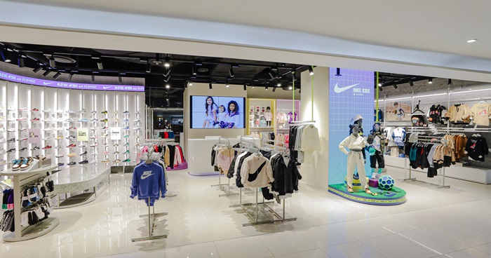이번에 오픈한 단독 매장은 아이들의 스포츠 감성을 일깨워 줄 수 있는 인테리어 콘셉트로 디자인되었다. 통통 튀는 컬러감과 농구, 축구 등 다양한 스포츠를 활용한 오브제를 곳곳에 설치해 내부 분위기를 한층 발랄하게 연출했다. 특히 매장 전면부에 배치한 슈즈존은 아이들이 자유롭게 신발을 신어볼 수 있는 공간으로 꾸몄으며, 나이키존과 조던존을 각각 구성해 고객들의 쇼핑 동선을 최적화했다.