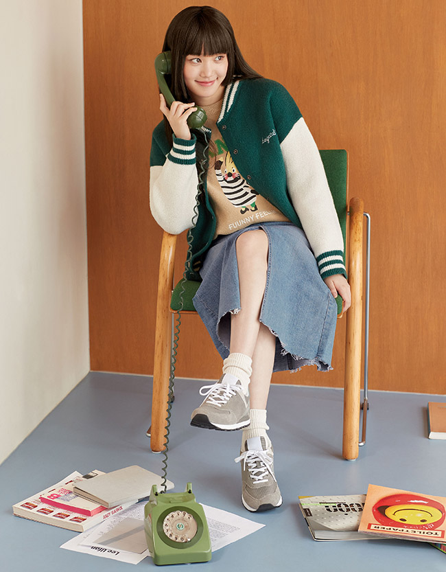 화보 속 이유비는 야구점퍼 스타일의 배색 포인트 아우터와 키치한 그래픽의 베이지컬러 니트, 앞트임 스타일 데님 롱스커트를 매치해 컬러감과 활동성이 돋보이는 가을 캐주얼룩을 완성했다.