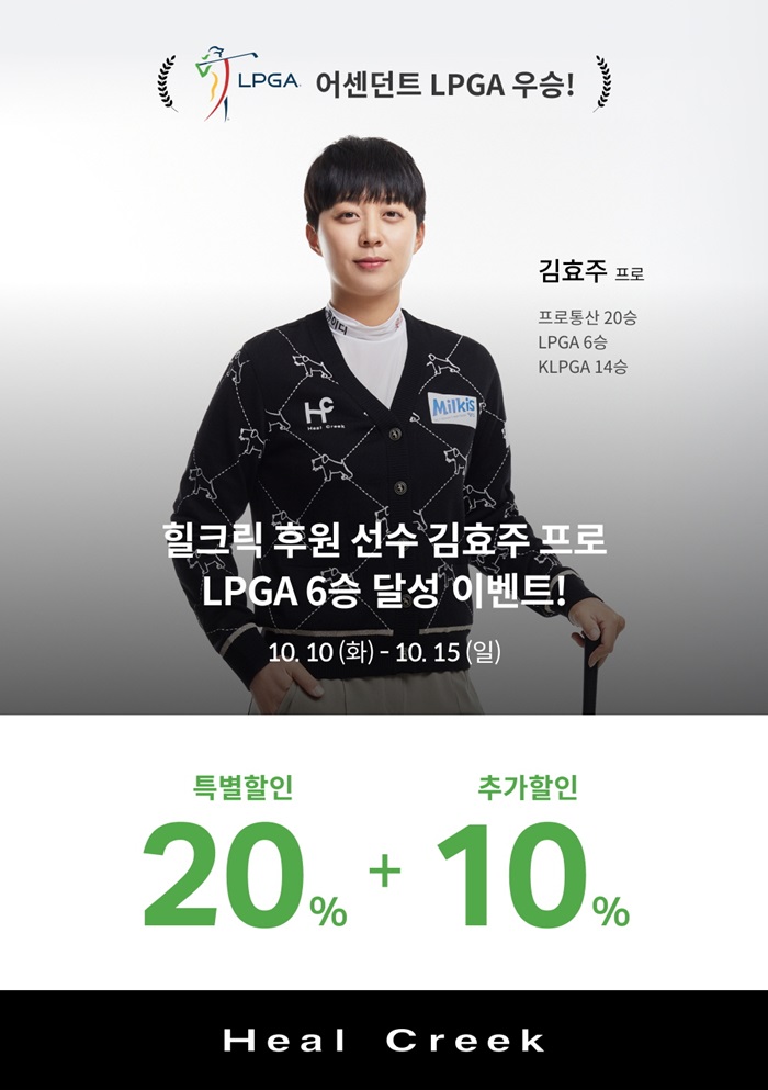 2018년부터 김효주 프로를 공식 후원하며 뜻깊은 인연을 이어가고 있는 힐크릭은 김효주 프로의 LPGA 통산 6승을 기념하기 위해 이달 15일까지 전국 오프라인 매장 및 온라인 공식몰에서 우승 기념 프로모션을 진행한다. 김효주 프로의 우승 착장과 더불어 2023년 F/W시즌 신제품을 20% 할인된 가격에 10% 추가 할인 혜택을 제공한다.