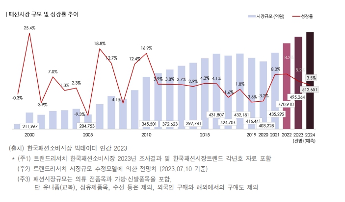 국내 패션시장은 2023년에도 3년 연속 플러스 성장을 기대하고 있고, 캐주얼복, 신발, 스포츠복, 여성정장 시장이 성장을 주도할 것으로 예측되었다.
