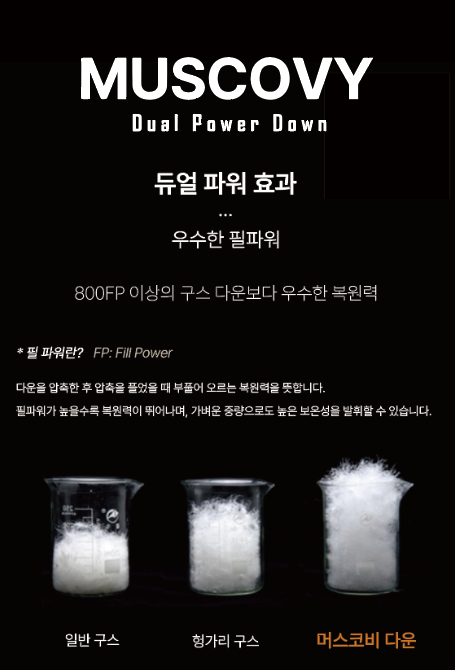 기능적으로 뛰어난 친환경 충전재 머스코비 다운은 초음파 워싱 공정을 통해 세척과정에서 사용되는 물의 양을 전통적인 워싱 라인보다 평균 30% 줄였으며, 친환경 생산에 집중하면서도 다운의 청결도 역시 기존 워싱 방법보다 우수하다.