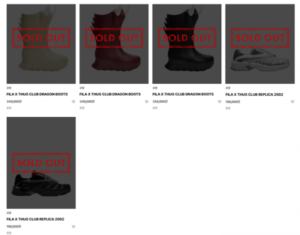 지난 1일 저녁 6시부터 휠라 공식 온라인 스토어에서 판매를 시작한 협업 제품들은 휠라의 헤리티지와 떠그클럽의 강렬한 아이덴티티를 섞은 티셔츠, 팬츠, 모자, 신발 등 13개 아이템으로 구성됐다. 특히 뿔이 달린 독특한 디자인으로 SNS 화제가 된 드래곤 부츠는 판매 시작 8분 만에, 레플리카2002를 떠그클럽의 독창적인 감성으로 재해석한 협업 운동화는 6분 만에 각각 품절됐다.