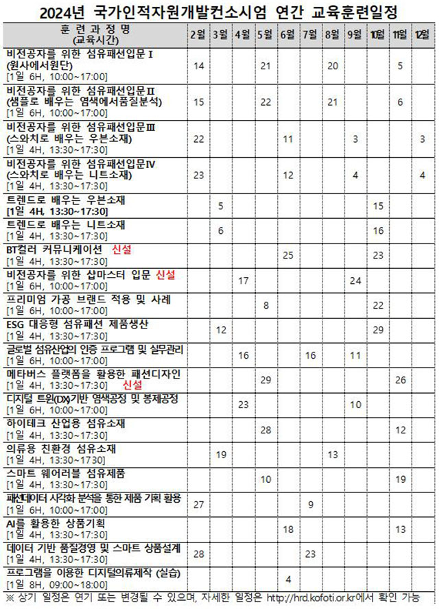 한국섬유산업연합회(회장 최병오, 이하 섬산련)는 섬유패션업계 재직자 직무능력 향상을 위한 2024년도 교육훈련 계획을 확정하고 2월부터 교육과정을 본격 시작한다.