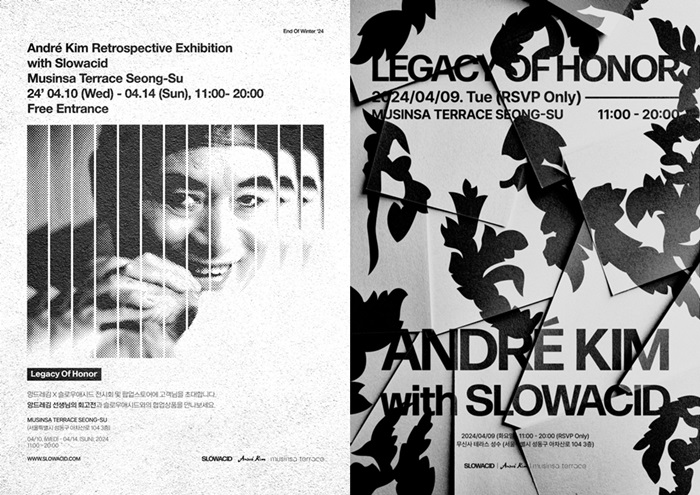 스트릿 캐주얼 브랜드 ‘슬로우애시드’와 국내 1세대 디자이너 브랜드 ‘앙드레김’이 협업한 첫 번째 콜라보레이션 24 S/S ‘Legacy of honor’의 출시를 기념해 전시 및 팝업스토어를 진행한다.
