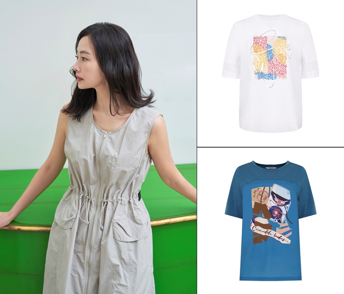 패션그룹형지의 냉감의류 상품. 사진 왼쪽부터 시계방향으로 샤트렌이 쿨비즈룩으로 제안하는 ‘시그니처 원피스’, 샤트렌 린넨 라이크 쿨링 소재 티셔츠, 크로커다일레이디 인견 티셔츠