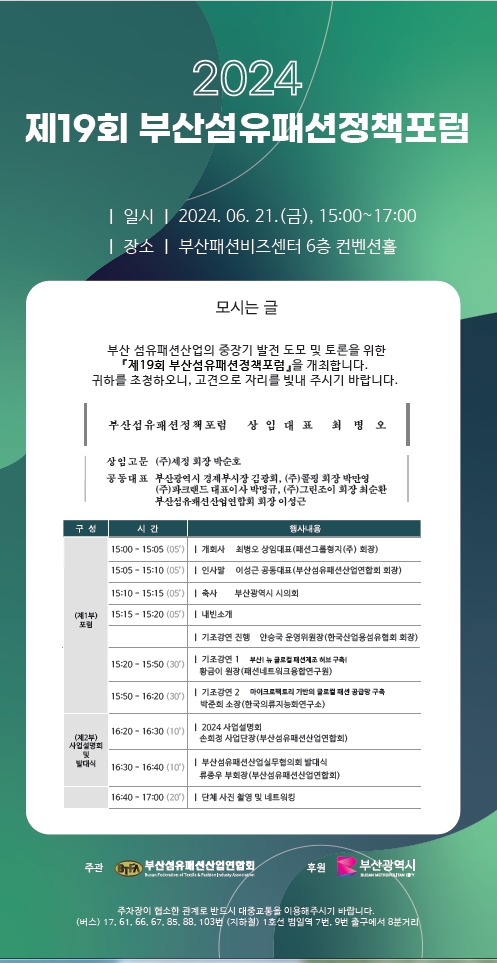 부산섬유패션산업연합회(회장 이성근)가 주관하는 ‘제19회 부산섬유패션정책포럼’이 오는 21일 오후 3시 부산패션비즈센터 6층 컨벤션홀에서 개최된다.