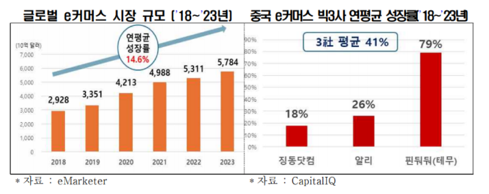 특히, 징동닷컴(중국 내수중심), 알리바바, 핀둬둬(테무 모기업) 등 중국 e커머스 빅3사의 최근 5년간 매출액 성장률(CAGR) 평균은 연 41.0%로 글로벌 e커머스 시장 성장률(14.6%)보다 2.8배 높았다.