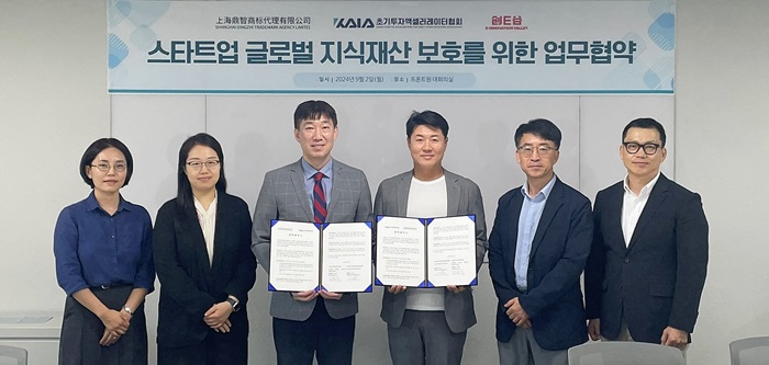 이랜드그룹의 상하이딩즈상표대리유한공사와 초기투자액셀러레이터협회(KAIA)가 국내 스타트업의 안전한 글로벌 진출을 위한 지식재산 보호지원을 목표로 업무협약을 체결했다.