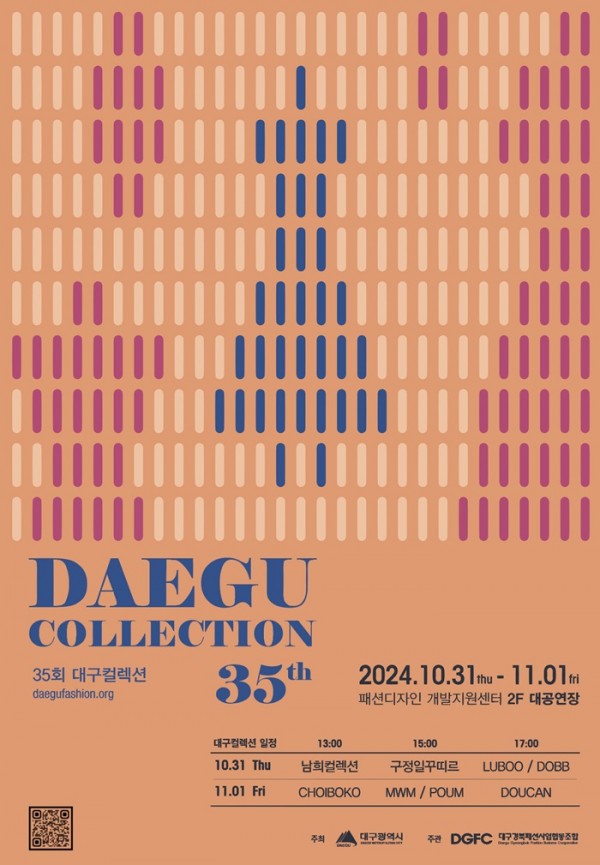 대구경북패션사업협동조합(이사장 정순식)이 대구광역시의 지역패션산업의 발전과 패션디자이너 브랜드의 마케팅 지원사업의 일환으로 2024 ‘제35회 대구 컬렉션‘을 오는 10월 31일부터 11월 1일까지 양일간 산격동 패션디자인개발지원센터(구 한국패션센터) 대공연장에서 개최한다.