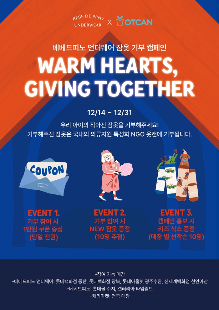 더캐리(대표 이은정, 윤중용)가 전개하는 프리미엄 유아동 언더웨어 브랜드 ‘베베드피노 언더웨어’가 ESG 경영의 일환으로 잠옷 기부 캠페인 ‘WARM HEARTS, GIVING TOGETHER’을 전개한다.