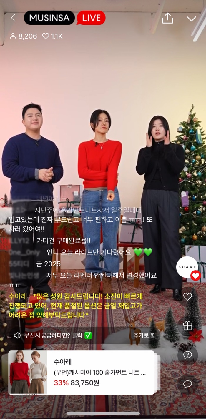 이번 방송은 수아레 우먼이 무신사와 함께 진행한 첫 라이브 방송으로, 유튜버 보라끌레르와 수아레 우먼 대표(김명진)가 직접 호스트로 나선 가운데, 지난 9일 무신사 라이브 커머스 전문 채널 ‘무신사 라이브’를 통해 단독 송출됐다.