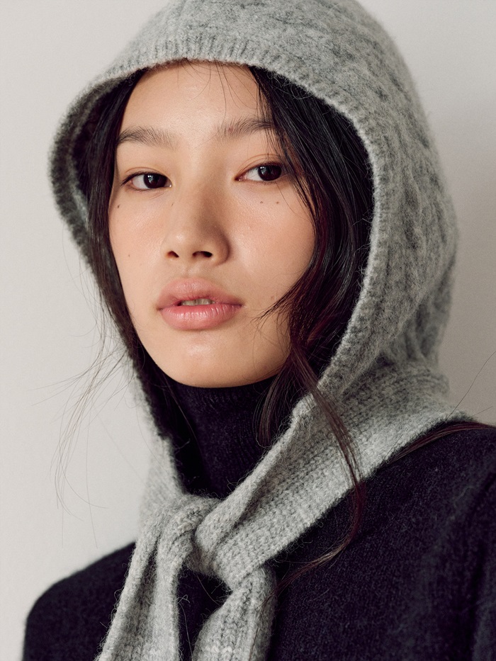 구호플러스 발라클라바는 얼굴에 딱 붙는 핏이 아니라, 목 부분의 스트랩을 묶어 핏을 조절할 수 있고 스카프처럼 매듭 지어 사랑스러운 분위기를 연출할 수 있다. 보송한 질감의 알파카 혼방 원사에 은은한 케이블 조직을 더해 유니크함을 강조했다.