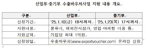 산업부에서는 중소·중견기업의 수출 활력을 제고하고자 지난해와 비교해 수출바우처사업의 국고 지원 규모(311억원 → 361억원)와 지원 대상 기업 수(823개사 → 1,000개사)를 모두 확대했다고 밝혔다.