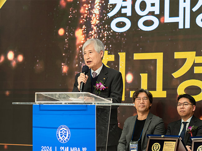 ◆영예의 제24회 연세MBA 최고경영자상 수상 소감을 하고 있는 임용빈 해피랜드코퍼레이션 회장.
