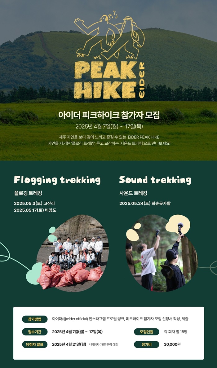 아웃도어 브랜드 ‘아이더’가 오는 5월 제주의 자연을 배경으로 진행되는 이색 트레킹 프로그램 '피크 하이크(PEAK HIKE)’의 참가자를 모집한다.