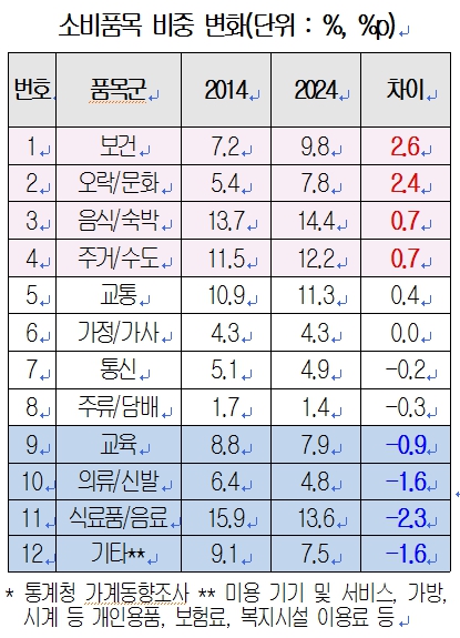 소비의 구조도 크게 달라졌다. 지난 10년간 가장 지출 비중이 크게 증가한 항목은 보건(2.6%p), 오락·문화(2.4%p), 음식(외식)·숙박(0.7%p), 주거·수도(0.7%p)순이었다. 고령화에 따른 의료 수요 증가와 함께 여가·취미 지출 확대, 외식·여행 등 가치(價值)소비의 보편화가 주요 요인인 것으로 보인다.