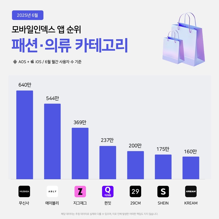 이에 따르면 지난 6월 패션·의류 카테고리 앱 사용자 수 1위는 무신사(640만명)가 차지했으며 이어 에이블리(544만명), 지그재그(369만명), 퀸잇(237만명), 29CM(200만명), 쉬인(175만명), 크림(160만명) 순으로 나타났다.