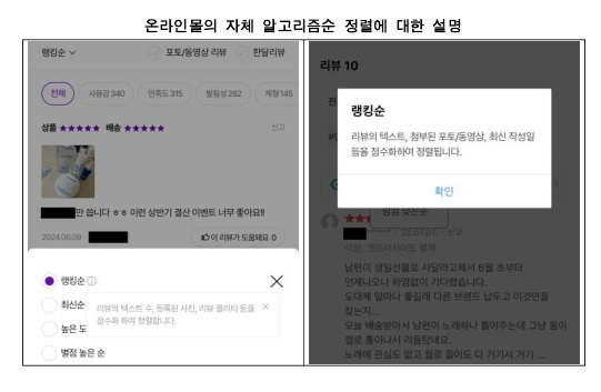 자체 알고리즘 정렬 방식은 리뷰 글자 수·작성일·평점(별점)·사진 포함 여부 등 온라인몰마다 기준이 달랐지만, 대부분 평점이 높고 장점 위주로 묘사된 리뷰를 먼저 표시하는 것으로 나타났다.