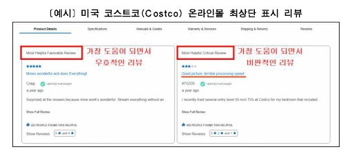 미국 ‘코스트코(Costco) 온라인몰’과 일본 ‘라쿠텐(Rakuten)’은 가장 도움이 되는 우호적 리뷰 1개와 가장 도움이 되는 비판적 리뷰 1개를 선정해 최상단에 별도로 표시해 소비자가 상품의 장단점을 쉽게 비교할 수 있도록 지원하고 있다.