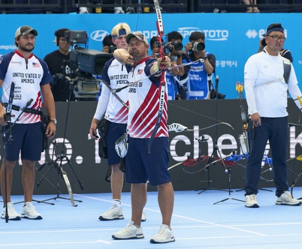 리커브 남자 단체전 결승에서 한국과 미국 양궁 선수단이 ‘코오롱스포츠’ 양궁화를 신고 경기하는 모습