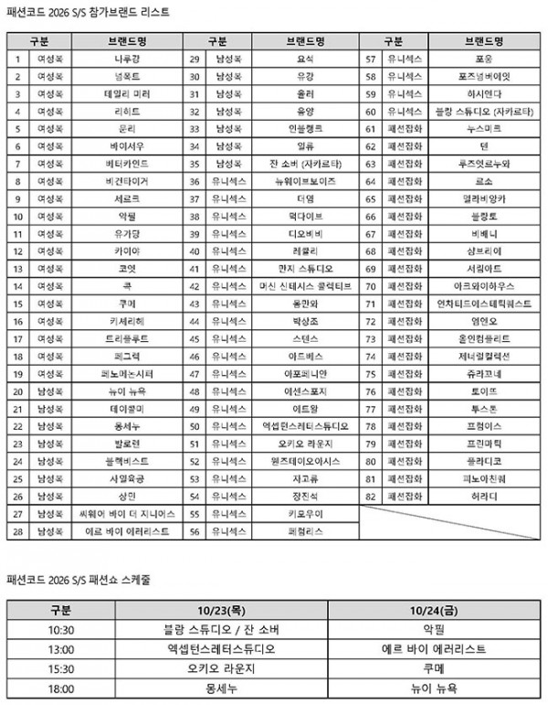 문화체육관광부(장관 최휘영)가 주최하고 한국콘텐츠진흥원(원장직무대행 유현석)과 한국패션디자이너연합회(회장 이상봉)가 공동 주관하는 패션코드 2026 S/S(이하 패션코드)가 오는 23일(목)부터 24일(금)까지 양일간, 서울 코엑스 본관 2층 '더 플라츠 전시홀'에서 열린다.