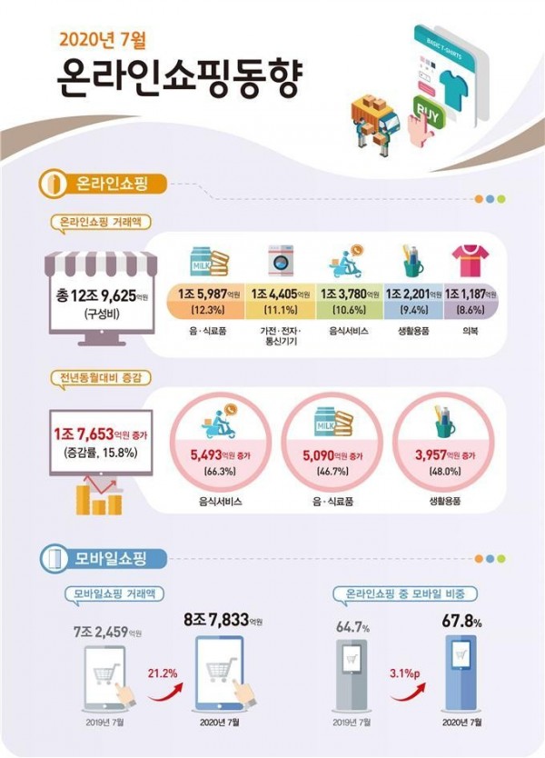 모바일쇼핑 거래액은 전년동월대비 식품(59.5%), 생활(56.3%), 가전(24.8%) 등 모든 부문에서 증가했다. 전월대비로는 패션(-7.0%) 등에서 감소했으나, 서비스(14.5%), 식품(10.4%) 등에서 증가했다.