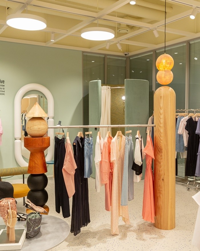 친환경 인테리어 마감재가 적용된 피팅룸 벽면의 면적은 총 150㎡(45평) 규모로, 여기에는 티셔츠 1만 5천벌, 약 3,000kg의 재고 의류가 사용된 셈이라고 회사 측은 설명했다.