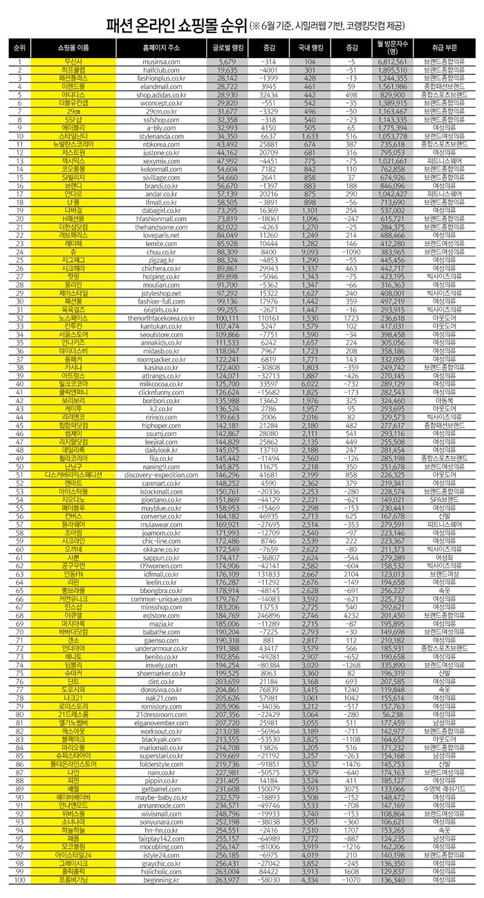 www.koranking.com)의 협조를 받아 조사한 ‘6월 패션 온라인 쇼핑몰 순위’에 의하면 100위권 쇼핑몰 중 글로벌 랭킹이 상승한 쇼핑몰은 47개로 전월과 비슷했다. 5월에는 43개, 4월에는 57개가 상승했었다. 월 방문자 수가 100만 명이 넘은 쇼핑몰은 11개로 5월에 비해 1개 늘었다.