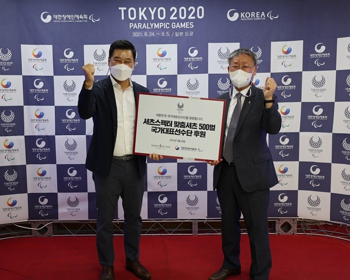 26일 오후 서울 송파구 대한장애인체육회에서 열린 후원 전달식에는 이성연 트라이본즈 대표와 양충연 대한장애인체육회 사무총장이 참석했다. 이 자리에서 셔츠스펙터는 어려운 환경 속에서도 훈련에 열중해 온 도쿄 패럴림픽대회 대표 선수단 및 장애인 국가대표 선수단 500명에게 4천만원 상당의 맞춤셔츠 제작을 약속했다.
