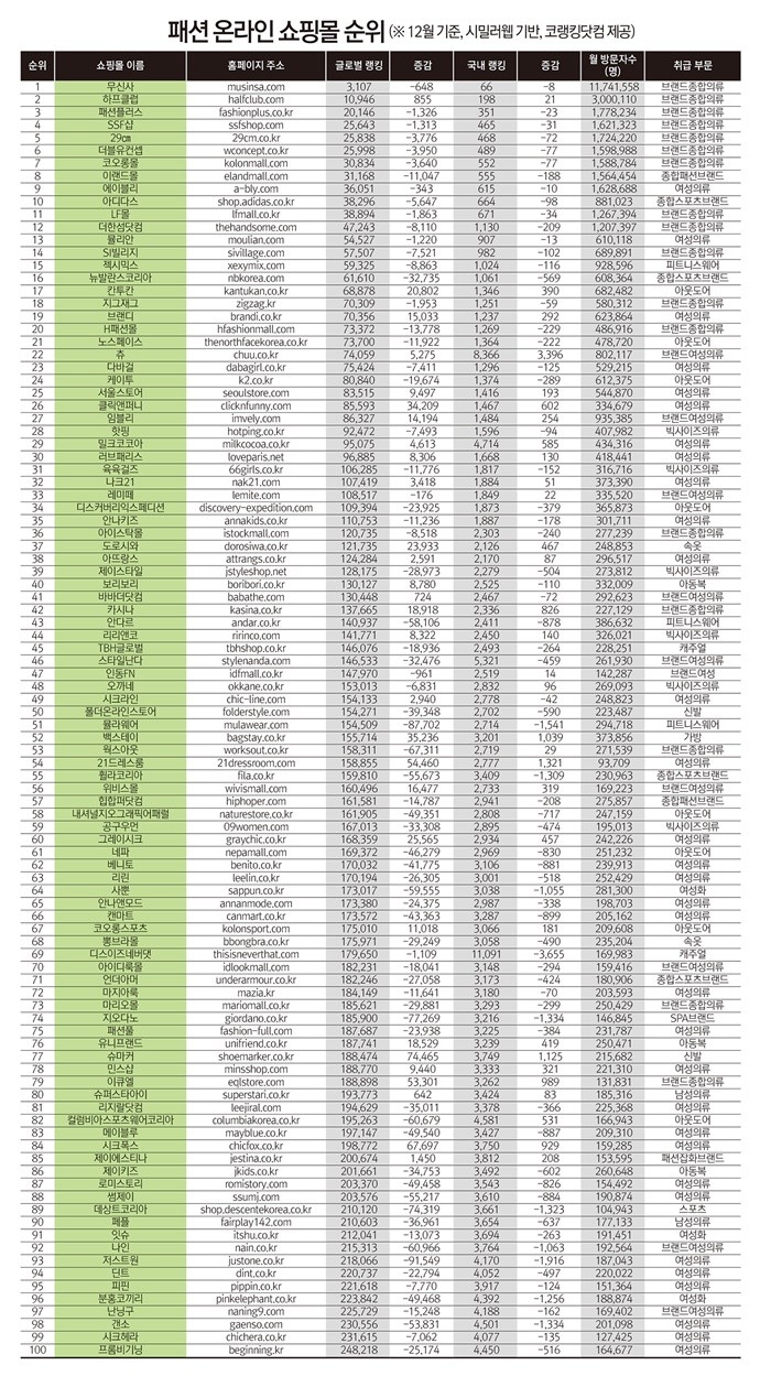 방문자 수와 검색량, 체류 시간 등을 종합적으로 평가해 매긴 패션 부문 글로벌 랭킹 1~10위는 무신사, 하프클럽, 패션플러스, SSF샵, 29㎝, 더블유컨셉, 코오롱몰, 이랜드몰, 에이블리, 아디다스 순으로 나타났다. 전월에는 무신사, 하프클럽, 패션플러스, 이랜드몰, 더블유컨셉, 29㎝, SSF샵, 코오롱몰, 뉴발란스코리아, 아디다스 순이었다. 무신사와 하프클럽이 부동의 1, 2위를 차지하고 있는 가운데 3~10위는 혼전 양상을 보였다.