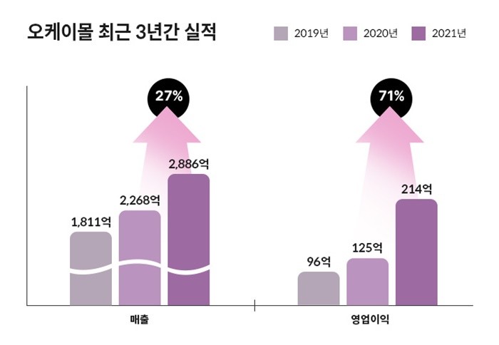 명품 이커머스 오케이몰이 2021년 매출 2886억원, 영업이익 214억원을 기록하며 17년 연속 성장을 이어갔다고 24일 밝혔다. 역대 최대 실적이다. 전년(2020년) 대비 매출은 27%, 영업이익은 71% 증가한 수치다.