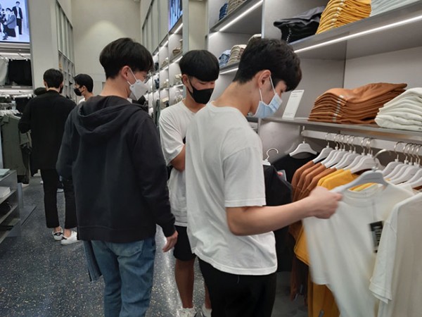 1층에서 젊은 고객 들이 옷을 고르고 있다.
