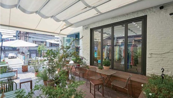 신사동 가로수길에 위치한 랭앤루 쇼룸 전경(왼쪽). 랭앤루 쇼룸 아래 ‘언더핑크’(오른쪽).랭앤루 관계자는 “브랜드의 옷이 화려한 컬러와 플라워 프린트 등 바캉스 느낌이 가득한데 코로나로 인해 여행이 자제된 분위기에서 고객들이 랭앤루 옷을 입고 야외 테라스나 언더핑크에서 사진도 찍고 음료도 마시면서 잠시나마 대리만족의 기분을 느끼는 것 같다”고 전했다.