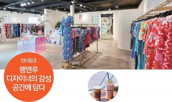 랭앤루 플래그십샵으로 컬러풀하고 러블리한 의류와 소품, 액세서리가 가득하다.원내 사진은 시그니처 음료인 언더핑크 에이드와 아인슈페너.확고한 브랜드 아이덴티티로 마니아층을 확보하고 있는 디자이너 브랜드 ‘랭앤루’(대표 박민선, 변혜정)가 지난 4월 신사동 가로수길로 쇼룸을 이전하면서 새로운 공간에 카페 ‘언더핑크’를 함께 오픈했다.