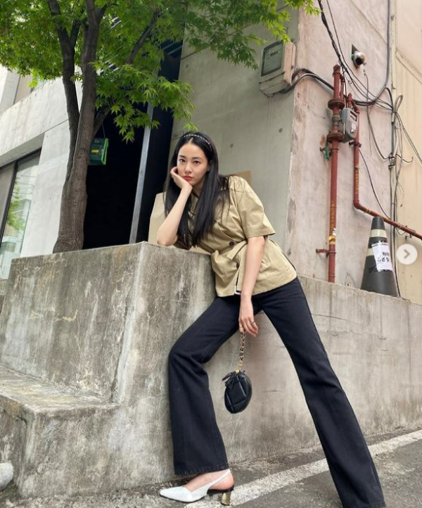 사진 속 이주연은 소매 볼륨이 특징인 베이지 컬러의 앳코너 재킷을 블랙 부츠컷 데님과 함께 매치해 캐주얼 하면서도 클래식한 패션 센스를 자랑했다. 이주연은 재킷의 벨트로 허리 라인을 강조해 바비인형 같은 몸매를 과시했다.