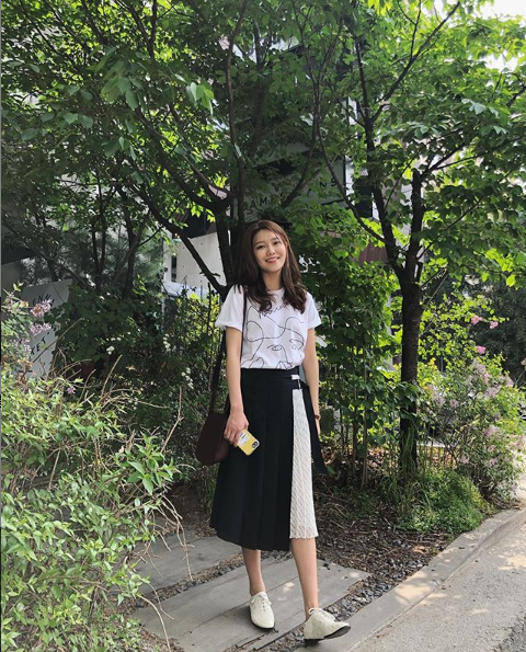 공개된 사진 속 수영은 산책로에서 환한 미소를 지어 보이며 여유로운 시간을 보내고 있는 모습이다. 평소 센스 있는 스타일링으로 패션 업계에서도 많은 러브콜을 받고 있는 수영은 일러스트 프린트가 인상적인 티셔츠에 모던한 A라인의 언발란스 플리츠 스커트를 코디해 스타일리시한 여름 패션을 선보였다. 수영이 착용한 티셔츠와 스커트는 모두 ‘제이제이지고트(JJ JIGOTT)’의 제품으로 알려졌다.
