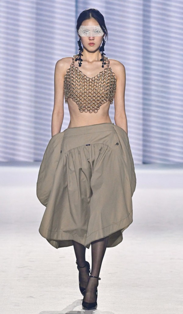 Furthermore this collection expands its material exploration: sweaters knitted from recycled paper, dresses constructed from discarded banners, and bustiers hand-woven from elastic bands reflect an ongoing interest in unconventional and sustainable materials and alternative methods of construction.