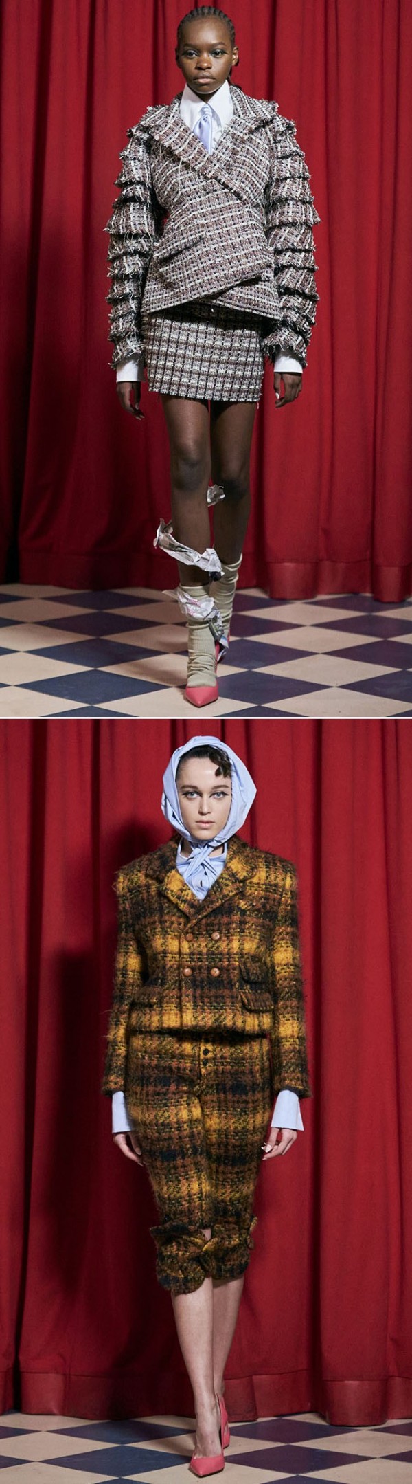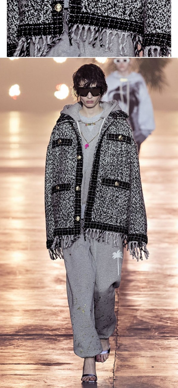 재킷 뿐 아니라, 스커트, 팬츠 등에도 적극 활용되고, 올풀린 디테일로 클래식한 느낌에서 벗어나 유니크함을 추구하며 유스마켓에도 어필하고 있다.
