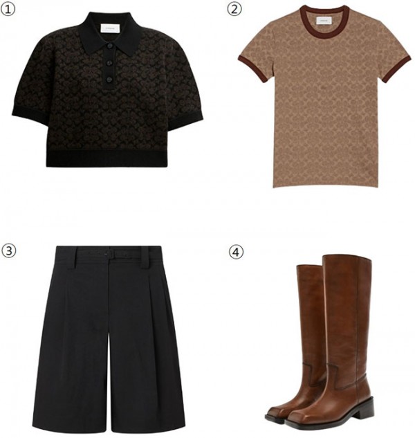 모노그램 패턴이 너무 도드라진다면 어두운 계열의 하프 팬츠를 매치하여 차분한 느낌을 주어 밸런스 있는 스타일링을 해보자. 여기에 계절을 가리지 않고 사랑 받는 가죽 소재의 스퀘어 롱부츠로 착용하여 시크한 캐주얼 스타일링 완성.