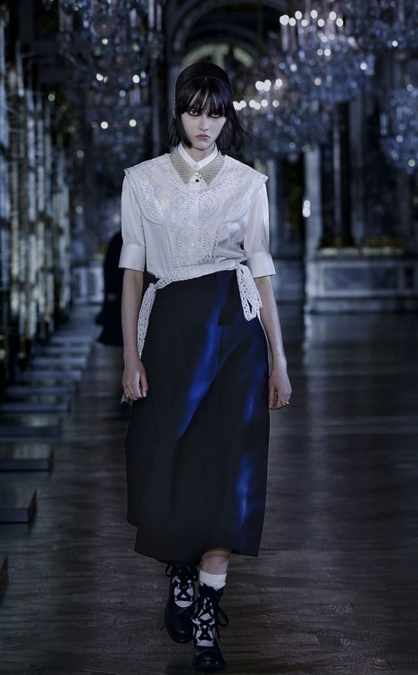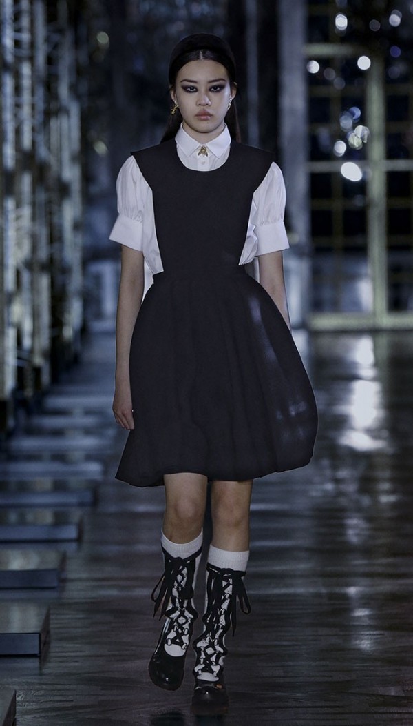 실용적인 소재와 글래머러스하고 장식적인 소재가 공존. 울 펠트, 홈스펀 트윌, 캐시미어, 코튼 포플린, 부클레, 벨벳, 글로시 레더, 브로케이드, 튤, 산갈리노(Sangallo) 레이스, ‘미녀와 야수’에서 영감을 받은 장미를 키 모티브로 사용. 음영 효과를 살려 어두운 분위기로 표현. 펑크적인 타탄 체크와 레오파드 모티브. 모노크롬과 다크 네이비가 중심을 이루는 가운데 립스틱 레드를 포인트로 첨가했다.