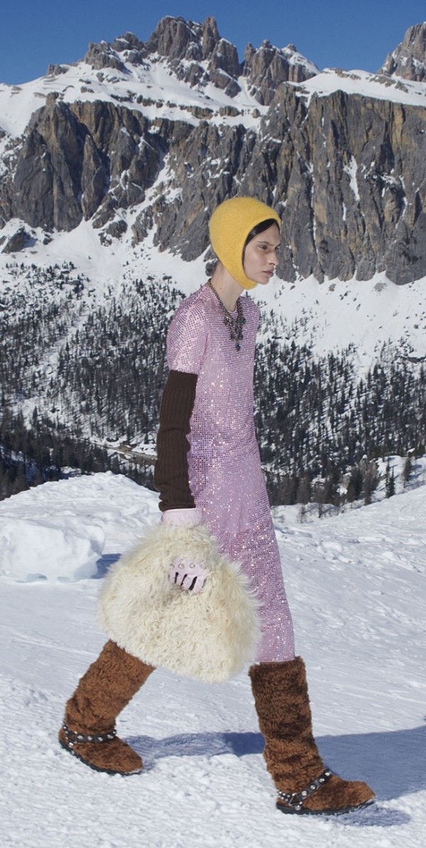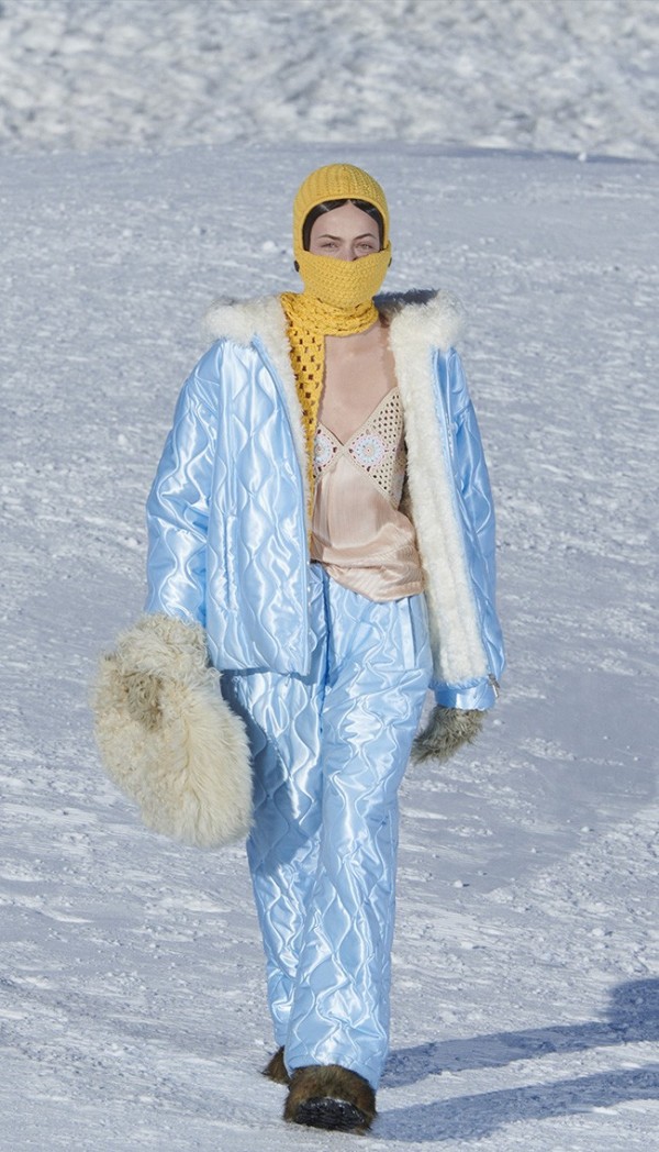 팬데믹 이후에 가고 싶을 것 같은 이탈리아의 눈 덮인 돌로미티(Dolomites) 산에서 쇼를 진행했다. 보호적으로 남아있고 싶은 심리와 드레스-업해서 나가고 싶은 심리를 동시에 담고 있다. 액티브 아웃도어를 상징하는 스키웨어와 인도어를 상징하는 란제리 드레싱, 니팅과 같은 소박한 크래프트와 펑크적인 장식의 대조. 아우터와 드레스에 집중했다.
