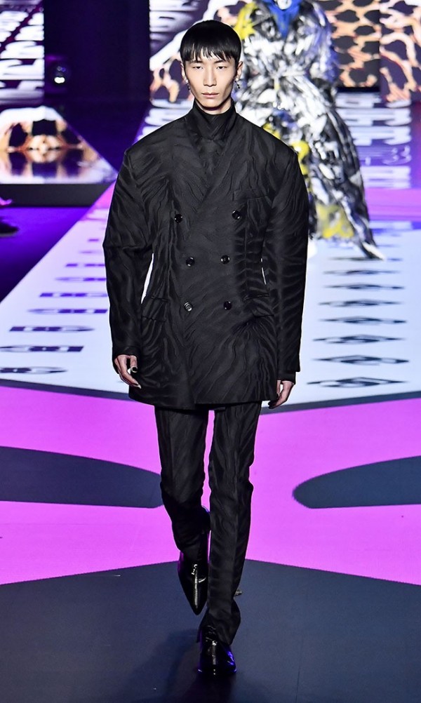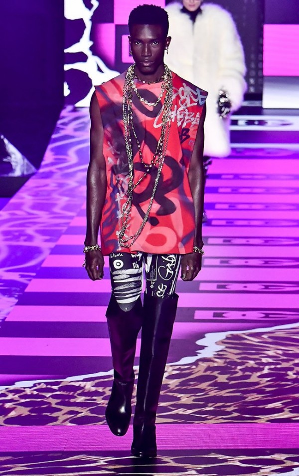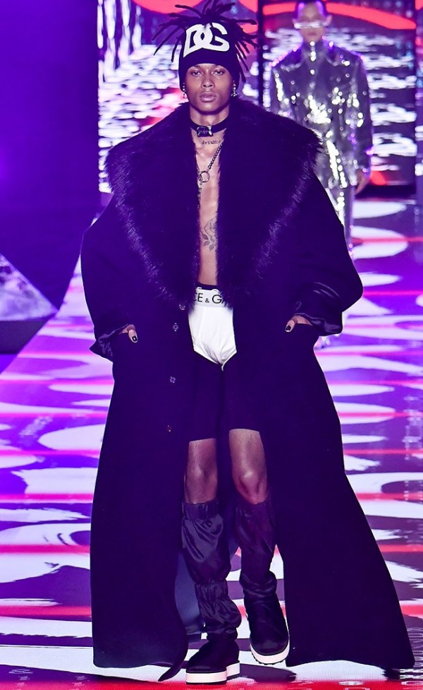 검은색과 흰색의 로고무늬가 부풀어 오른 다운 재킷, 맨 몸의 브리프와 매치한 장엄하고 압도적인 전신 코트, 화려함을 더하기 위한 모조 다이아몬드 목걸이 등 지나친 과장.