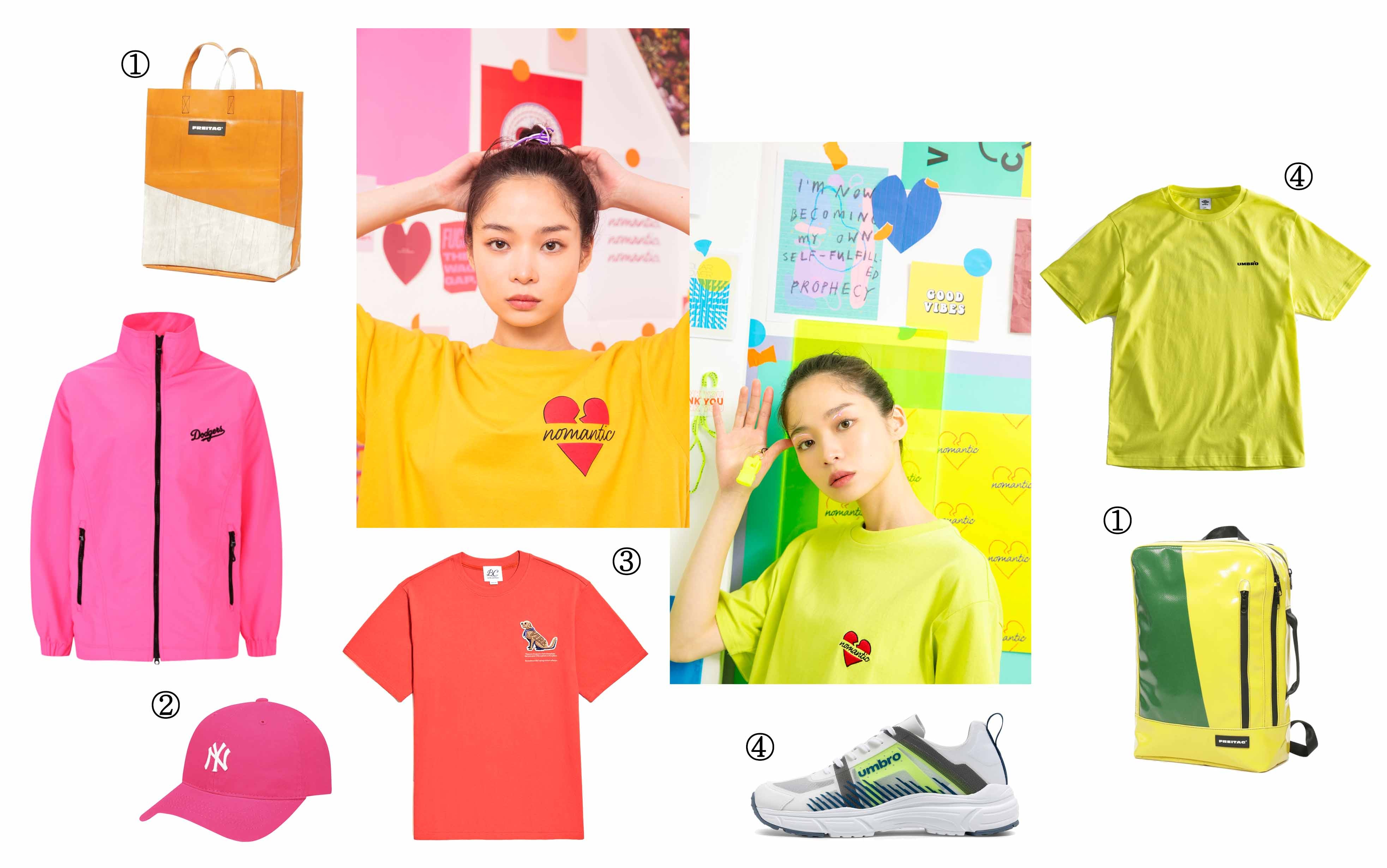 이번 시즌부터 트렌드 컬러로 급부상한 네온 컬러는 눈에 띄는 강렬한 컬러감이 특징으로, 2019년 메가 트렌드답게 의류와 가방, 모자, 신발까지 다양한 제품으로 출시되고 있다. 네온 컬러는 활기차고 경쾌한 스타일을 연출할 수 있어 여름철 포인트 아이템으로 제격이다. 네온 컬러에 처음 도전하는 입문자라면 티셔츠나 점퍼 등의 의류보다는 가방이나 신발, 모자 등의 아이템을 네온 컬러로 선택하거나 네온 컬러 로고나 레터링이 포인트로 들어간 아이템을 활용하면 과하지 않은 스타일링을 완성할 수 있다. 이때 한 착장에 다양한 네온 컬러 아이템을 매치하는 것은 피하는 게 좋다.