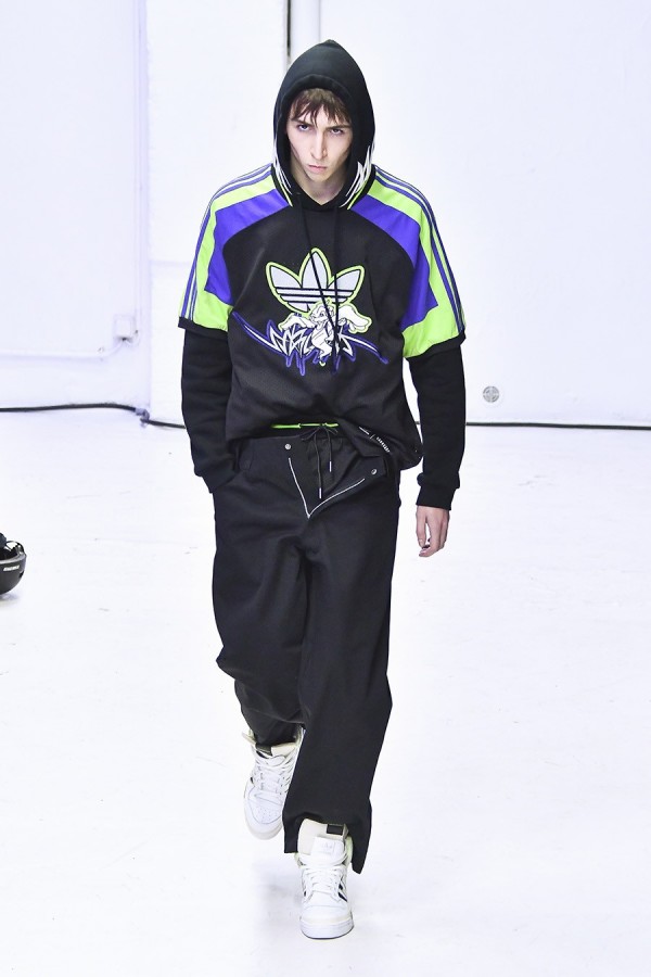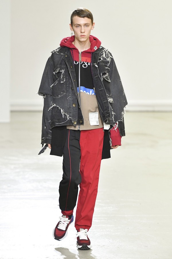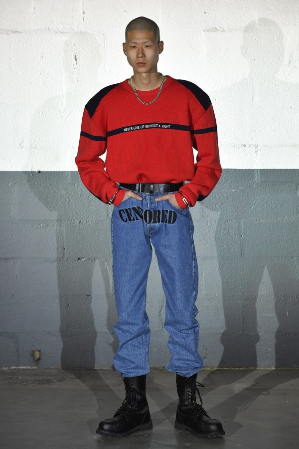 또한 복고적인 테크니컬이 첨가된 스타일이 주를 이루었는데, 나일론 및 코튼 저지, 플리스 저지, 워싱 및 그런지한 터치의 데님 및 일부 래더까지 활용되며 사용감이 느껴지는 듯한 가공이 더해졌다.