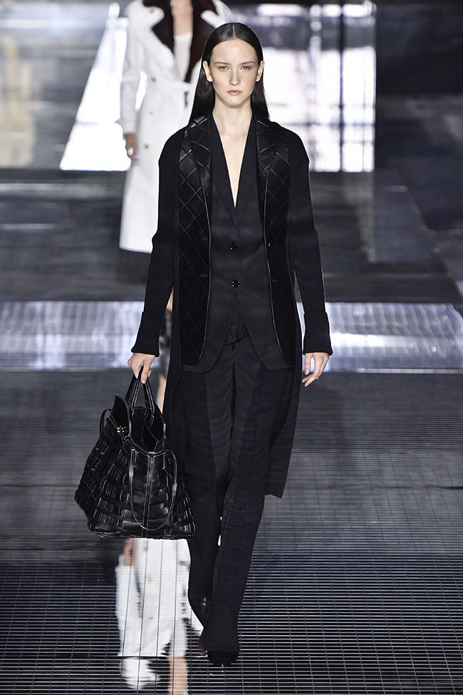 소재는 글로벌 마켓을 고려해 시즌리스적으로 접근했다. S/S 소재부터 F/W 소재까지 총 망라됐는데 울 트윌, 파나마 수팅, 쿨 울 수팅, 신세틱 개버딘, 벨벳, 포플린, 조젯, 크레이프 드 신, 레더, 몽골리안 램 등이 대표적이다. 보디컨셔스 실루엣을 편안하게 표현할 수 있는 소재도 강조됐는데 파인 니트, 실키 저지뿐만 아니라 플리셰 소재가 특징적으로 사용됐다.